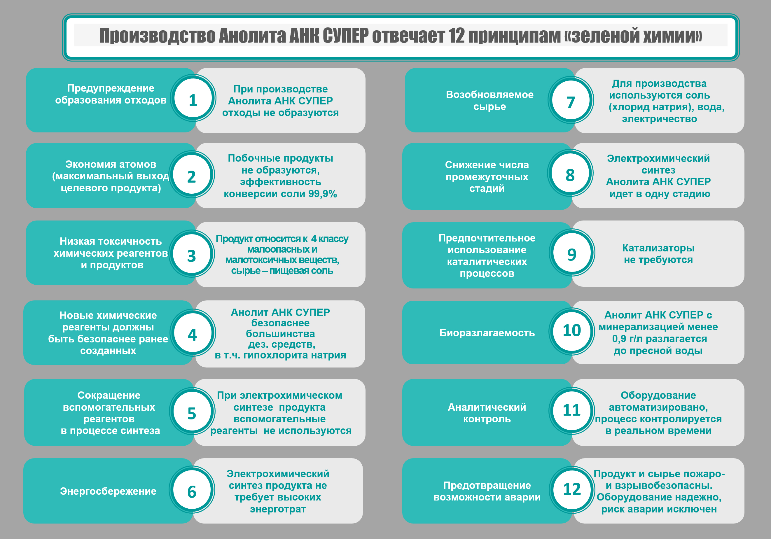 Производство и применение электрохимически активированных растворов с полным основанием можно отнести к «зеленым» технологиям, направленным на создание экологически чистых, эффективных и безопасных продуктов, а получаемое электрохимическим синтезом дезинфицирующее средство – к «зеленой» химии.